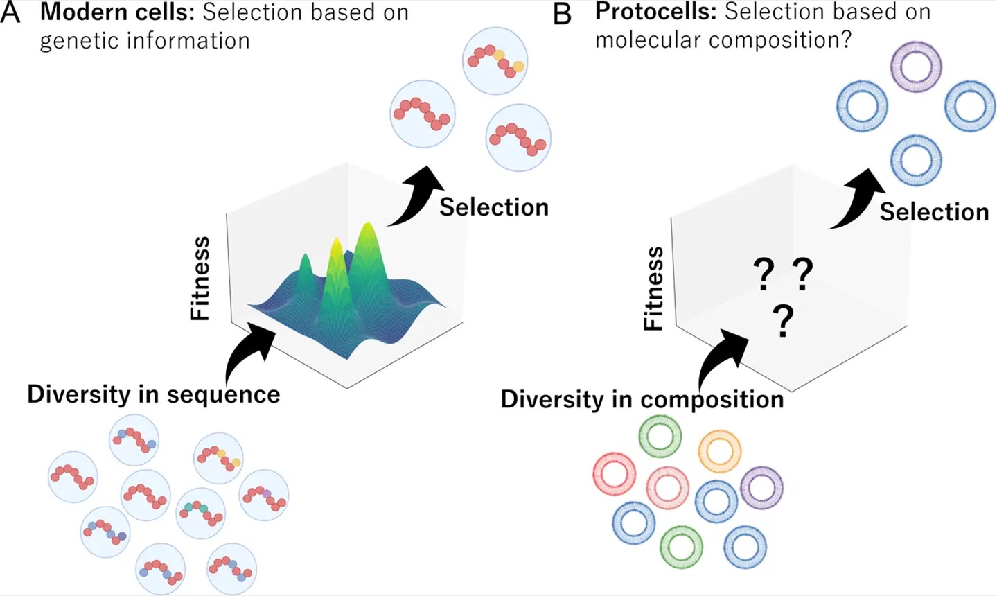 (B) At the earliest stage of life, the “evolution” of primordial cells was likely far simpler. Diversity in molecular composition would have directly shaped protocell behavior through their physicochemical properties, allowing molecules with advantageous traits to be preferentially retained. Such composition-driven selection may have formed a primitive basis for evolutionary change.