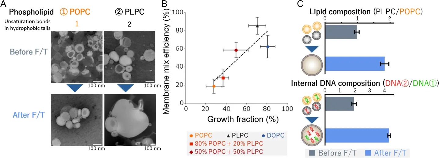 But what does this mean for the origin of life? When LUVs merge, their contents could mix and interact. In the "soup" of organic molecules on a primordial Earth, these fusion episodes might have brought important molecules together where they could react and become more like what we recognise as cells today. The team verified this by studying how well 100% POPC and 100% PLPC LUVs retained DNA. Not only were PLPC vesicles better at capturing DNA before F/T, but with each F/T cycle, they retained more DNA than POPC vesicles.