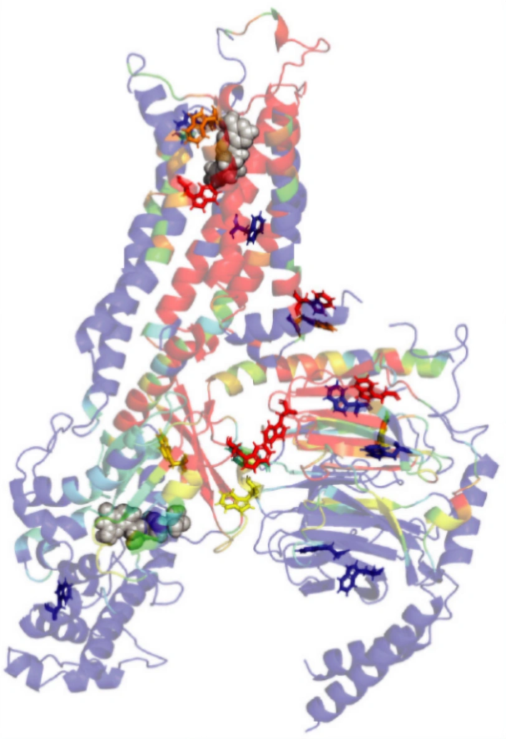 Figure 1: Tryptophan-rich allosteric communication network in a GPCR. Computational analysis using rigidity-theory indicates that activation of the human adenosine A2A receptor (shown here) is regulated by long-range allosteric communication pathways (highlighted in red and other bright colors). Many tryptophan residues (shown as sticks) lie along these pathways, supporting their role as key nodes in the allosteric network that controls GPCR activation and functional state regulation.