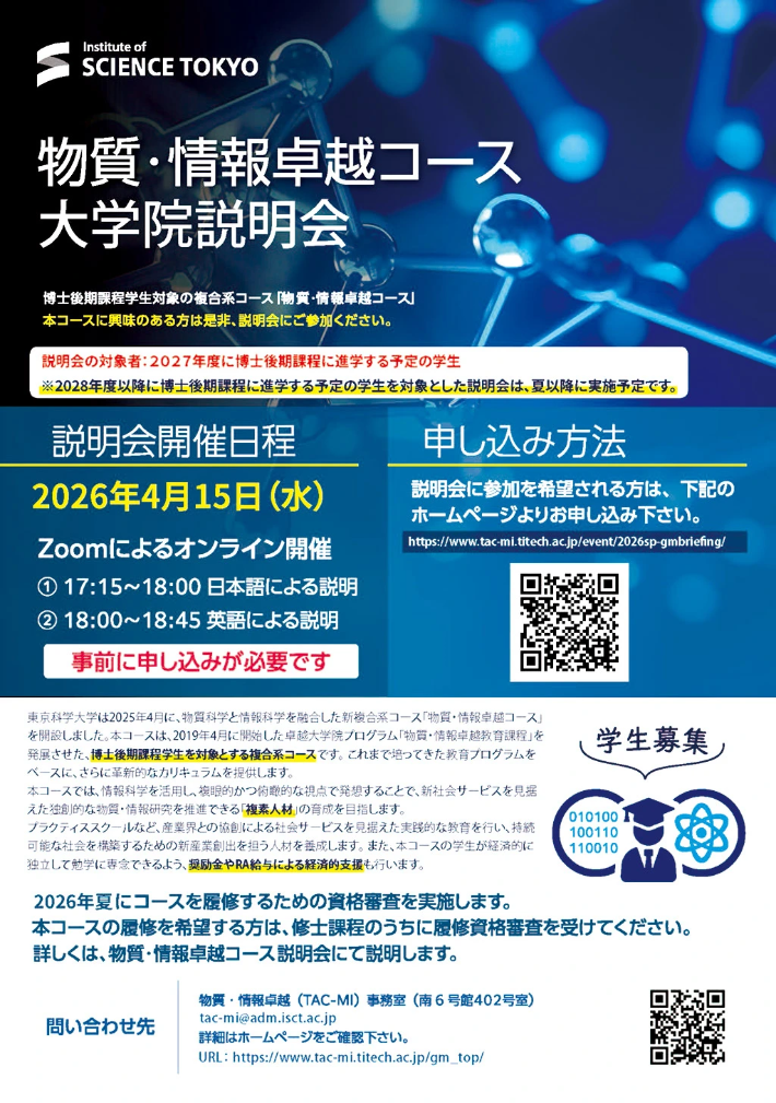 2026年夏にコースを履修するための資格審査を実施します。本コースの履修を希望する方は、履修資格審査を受けてください。詳しくは、物質・情報卓越コースの説明会にて説明します。本コースに興味のある方は是非、説明会にご参加ください。