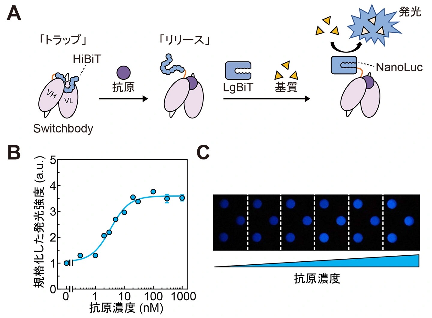 実際にSwitchbodyを大腸菌で発現させたあと精製し、NanoLuc由来のもう一方の酵素断片であるLgBiTと基質であるフリマジンの存在下で発光強度を測定したところ、抗原濃度依存的にシグナルの増大が確認されました(図1B)。この増大は市販のカメラでも明瞭に検出できるほど顕著であり、Switchbodyが簡便に利用できる生物発光免疫センサーとして、応用展開し得ることが示されました(図1C)。