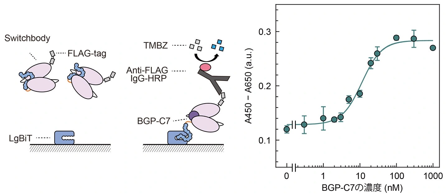 Switchbodyとして、発光酵素NanoLuc由来の11アミノ酸断片であるHiBiT[参考文献3]を、抗体KTM219の一本鎖抗体断片scFvのN末端側に融合させたタンパク質を設計し、酵素活性で抗原を検出できるかどうかを検討しました。KTM219は、骨粗鬆症のマーカーであるオステオカルシン(BGP)のC末端の7アミノ酸BGP-C7(アミノ酸配列:RRFYGPV)を抗原として認識する抗体です。この酵素断片融合抗体の分子デザインは、私たちがこれまでに開発してきた蛍光免疫センサーQ-bodyに着想を得ています。Q-bodyは抗体のN末端側に蛍光色素を修飾することで作製されます。この蛍光色素は抗原結合部位近傍でトラップされ消光状態となりますが、抗原の結合に伴ってリリースされることで蛍光を発します[参考文献4]。この原理に倣い、Switchbodyでは抗体に融合した酵素断片がトラップされますが、抗原との結合によりリリースされると、残りの酵素断片と相互作用することで酵素が再構成されて活性を示すことを想定しました(図1A)。