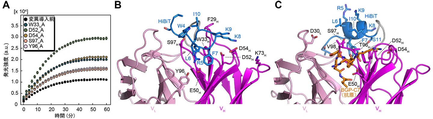 HiBiTの抗体へのトラップについて、具体的にどのような相互作用でトラップが引き起こされているかを調べるためにMDシミュレーションを実施し、抗原非存在下でscFvのアミノ酸残基のうちHiBiTと高頻度で接近する残基を8カ所予測しました。この8つのアミノ酸をそれぞれアラニン(Ala)に置換したSwitchbodyを作製してLgBiTを固相化したELISAで評価することで、変異導入前と比較してシグナルが有意に高い、すなわち変異導入によりHiBiTのscFvへのトラップが弱まっていると考えられる5つの変異体を選択しました。その中でも、抗体の重鎖の52番目のアスパラギン酸(Asp52H)をAlaに置換した変異体は、変異導入前や他の変異体と比較して、抗原非存在下で最も高い発光強度を示したことから(図3A)、Alaへの置換によってHiBiTの9番目のリシン(Lys9)との静電相互作用(図3B)が解消されることでトラップが弱まったと考えられました。一方、抗原存在下でSwitchbodyの発光強度が増大する理由としては、抗原がAsp52Hと相互作用することで、Lys9の静電相互作用の相手が失われて、HiBiTがリリースされるためと推測されました(図3C)。これらの知見は、抗原結合によって活性がオンになるタンパク質スイッチを自在に作製する技術を確立するための重要な手掛かりとなると期待されます。