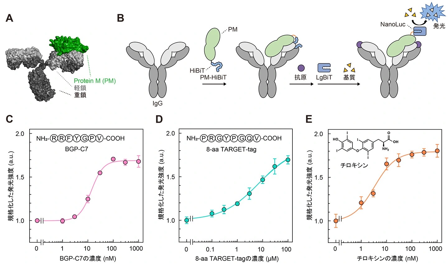 最後に、Switchbodyの作動原理が抗体の種類を変えても成立するかを検証しました。効率よく検証するために、抗体の軽鎖に強く結合するProtein M(PM)[用語8] [参考文献5](図4A)のC末端側にHiBiTを融合したPM-HiBiTを作製して抗体と混合し、HiBiTが抗体にトラップされ、抗原結合によりリリースされるかどうかを確認しました(図4B)。抗BGP抗体KTM219、抗TARGET-tag抗体P20.1、抗チロキシン抗体ME.125の3種類の抗体を用いて検証したところ、いずれの抗体においても抗原濃度依存的に発光強度が増大しました(図4C–E)。興味深いことに、P20.1はKTM219においてHiBiTとの静電相互作用に重要であったAsp52Hを欠いているにもかかわらず、抗原濃度依存的に酵素活性が上昇しました。これは、酵素断片と抗原結合部位近傍のアミノ酸との相互作用が静電相互作用に限定されず、多様な様式で相互作用し、抗原結合に伴ってリリースされ得ることを示しています。つまり、抗体のN末端側に酵素断片を融合するだけで抗原濃度依存的に酵素活性を上昇させる仕組みを構築できる可能性が示されました。一方、未発表ではありますが、NanoLuc以外の酵素を使ってもSwitchbodyを作製できることが判明しており、今後、さまざまな酵素と抗体との組み合わせで多様なSwitchbodyを作製していく予定です。