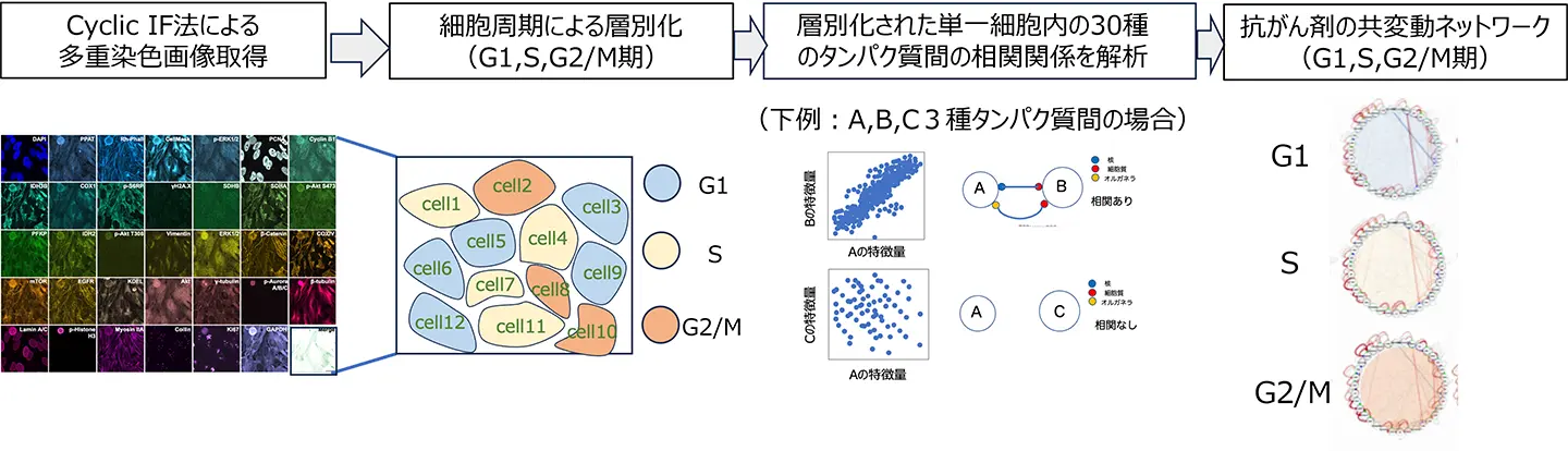 図1. シングルセル型PLOM-CON解析の概要。細胞周期(G1, S, G2/M期)によって層別化された単一細胞の多重染色(>30色)画像を取得し、それぞれの細胞ごとに30種以上のタンパク質情報(特徴量)を紐づけ、細胞ごとの相関関係をもとに共変動ネットワークを求めた。