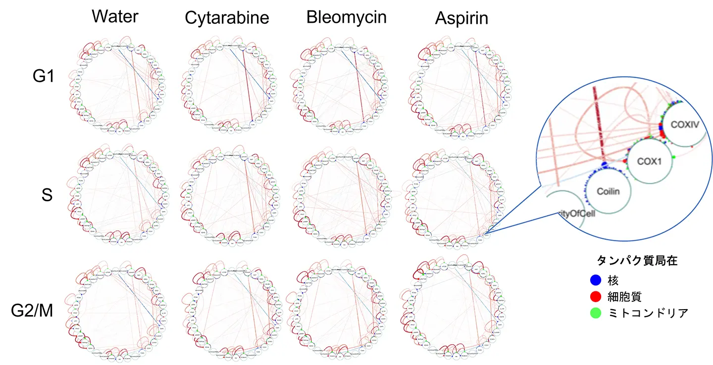 図2. シングルセル型PLOM-CON解析より得られた細胞周期別のタンパク質共変動ネットワーク。抗がん剤のシタラビンあるいはブレオマイシン、がん予防薬のアスピリン、コントロールの水を加えて作用させた細胞に対しsc-PLOM-CON解析を行い、タンパク質の細胞間共変動を表すネットワークを構築した。ノードはタンパク質や形態特徴量、ノードの周りの色つきの小円は局在情報、エッジ(辺)は相関関係の有無を表す。(Noguchi et al., Communications Biology, 2025より一部改変)