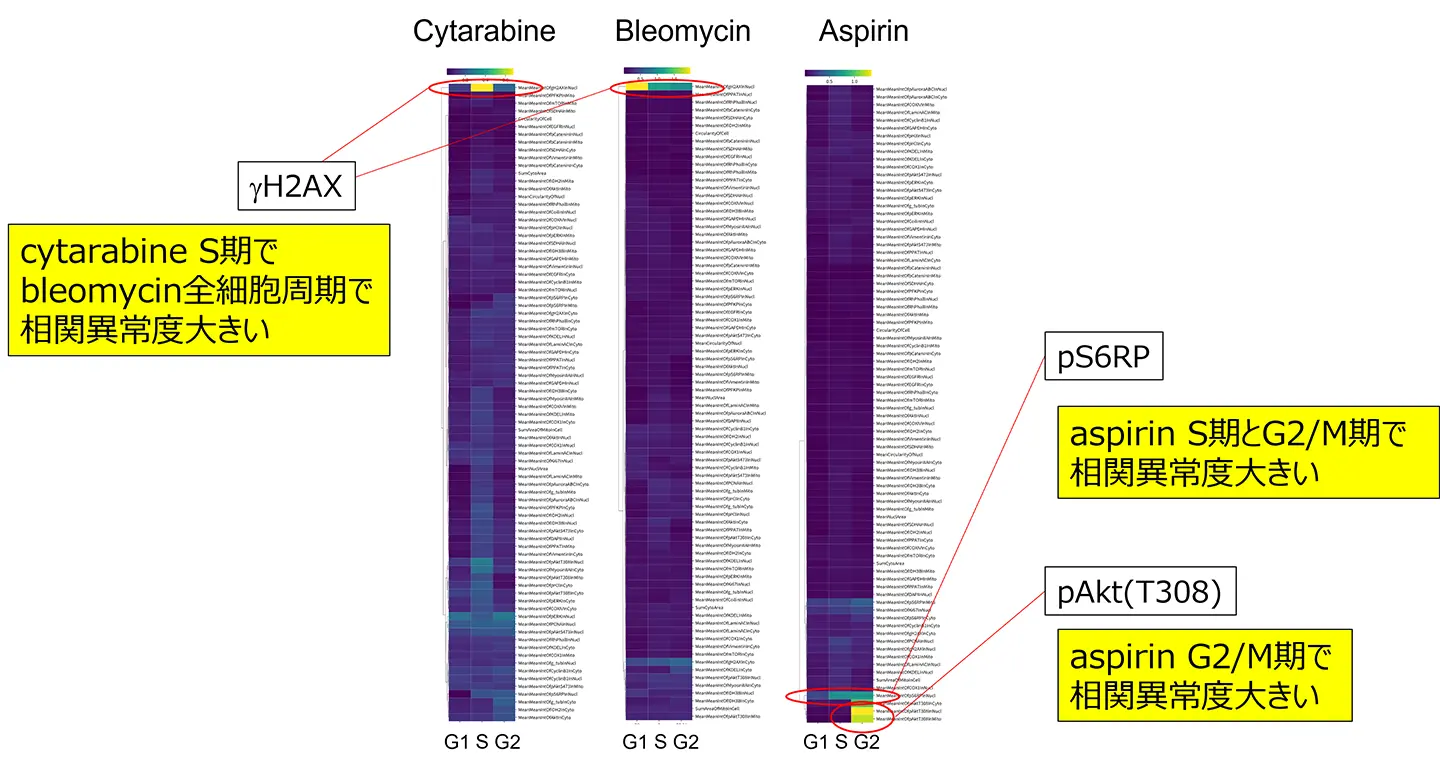 シタラビンの場合、相関異常度が高い特徴量は主にS期の核領域におけるγH2AXの平均蛍光強度に関連していました(図3)。γH2AXはDNA損傷のマーカーであり、DNA二本鎖切断(DSB)により核内で増加します。この結果は、シタラビンによるS期でのDNA複製阻害に関連すると考えられます。また、ブレオマイシン処理細胞では、核領域のγH2AX平均蛍光強度の相関異常スコアがG1、S、G2期のいずれでも高くなりました(図3)。ブレオマイシンには細胞周期全体でDNA切断機能があり、それをうまく説明します。これらの結果は、薬剤の可視的な細胞周期停止作用が現れる前(薬剤処理後、24時間)よりもずっと早期(薬剤処理後、4時間)に、共変動ネットワークレベルで異常が始まっていることを示す重要な知見です。アスピリンの場合、相関異常スコアが高い特徴量は主にS期およびG2/M期の核領域におけるリン酸化S6RPの平均蛍光強度に関連していました(図3)。リン酸化S6RPはタンパク質翻訳に関与し、アスピリン処理でその異常はタンパク質合成の阻害につながることを示せました。また、G2/M期のリン酸化Akt(S308)も相関異常度が高く、M期の細胞がアスピリン処理で増加した影響によるものと考えられます。