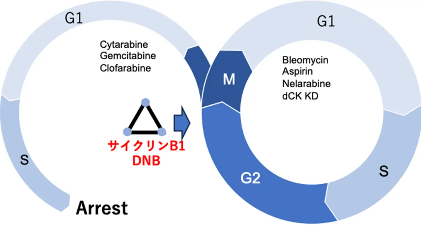 signal)」として同定されました(図4)。つまり、抗がん剤シタラビンによるS期での細胞周期停止の予兆として、処理細胞のG2/M期では細胞質と核内のcyclin