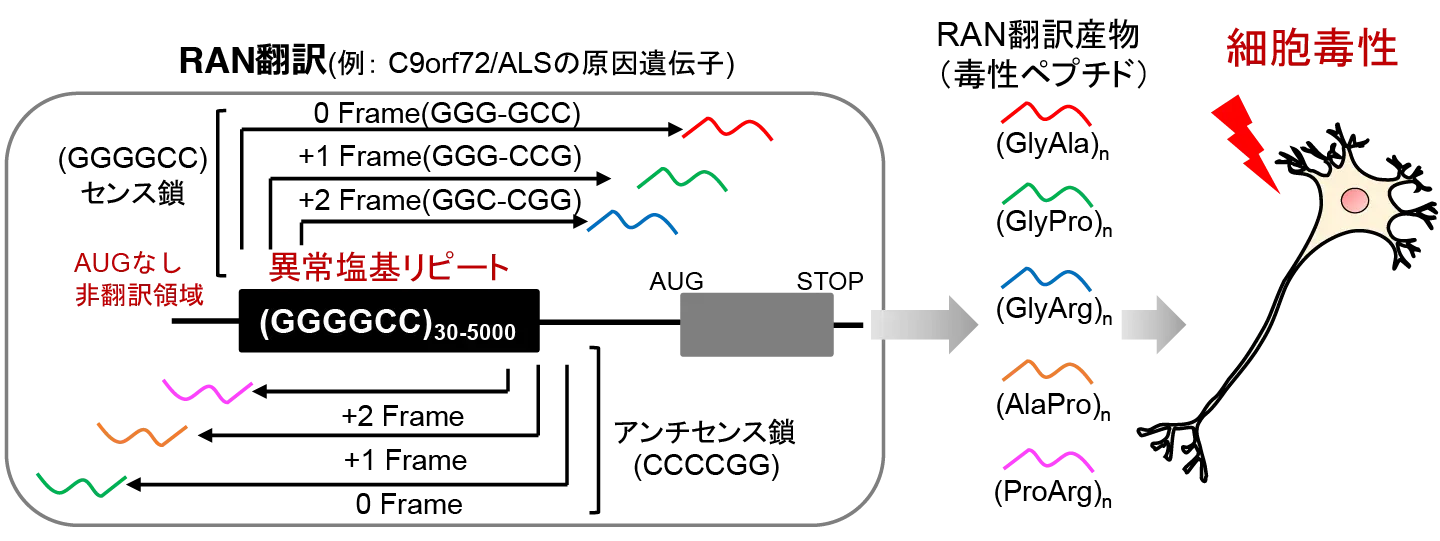 筋萎縮性側索硬化症(ALS)は運動神経が変性し、全身の筋肉が急速に衰えていく難病指定されている神経変性疾患です。前頭側頭型認知症(FTD)は、アルツハイマー型認知症やレビー小体型認知症に次いで多い認知症で言語障害などを引き起こす神経変性疾患として知られています。これらの疾患で高頻度に見られる遺伝変異として、C9orf72遺伝子内に存在するGGGGCCという6つの塩基からなる配列の異常な繰り返しが検出されていました。この繰り返し(リピート)配列を持つRNAでは、教科書的な翻訳開始機構に依らないRAN翻訳(図1)と呼ばれる異常なタンパク質合成が発生することが知られています。このRAN翻訳で合成されるタンパク質は細胞毒性を持っており、神経細胞の機能障害や細胞死を誘発するため病態との関連が示唆されています。RAN翻訳について分子機構の解析は行われているものの、その詳しいメカニズムや制御因子についてはよく分かっていませんでした。