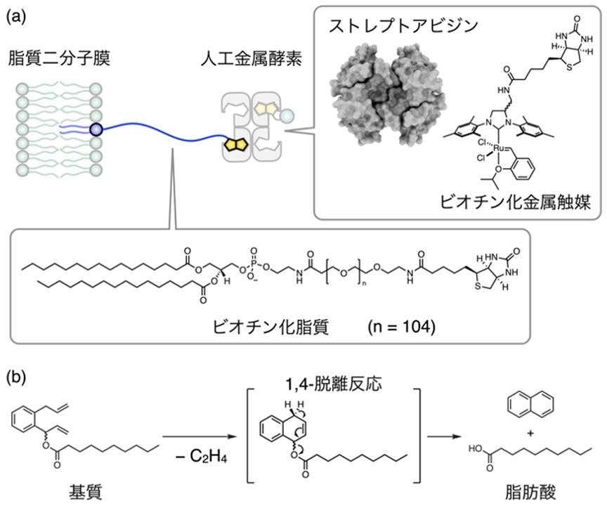 図2.(a)膜プラットフォームの模式図。閉環メタセシス反応を触媒する人工金属酵素を、ビオチン化脂質によって脂質二分子膜表面へ固定する。(b)閉環メタセシス反応により脂肪酸を放出する基質の化学構造