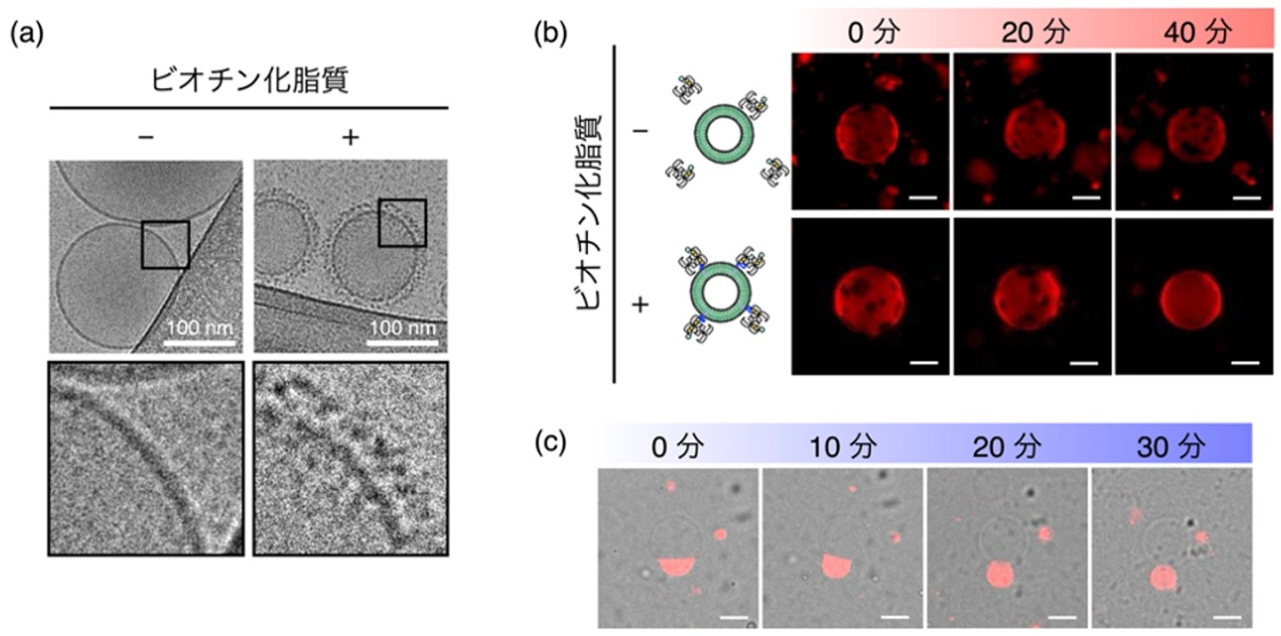 図3.(a)人工金属酵素が結合したリポソームのクライオ電子顕微鏡像。(b)相分離ドメインを有する巨大リポソームの基質添加後の蛍光顕微鏡像。上)ビオチン化脂質を含まないリポソーム、下)ビオチン化脂質を含むリポソーム。リポソーム内で黒く見える相分離ドメインが40分後に消失。(c)大きな相分離ドメインを有するリポソームの基質添加後の蛍光像と明視野像の重ね合わせ