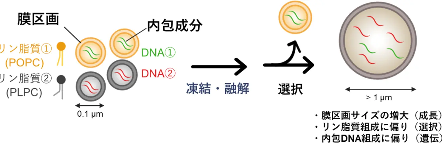 原始細胞は、現代の細胞に比べて外部環境の影響をより強く受けたと考えられます。そこで本研究では、凍結・融解という環境条件が原始細胞の挙動に与えうる影響を、リン脂質[用語2]で作製した区画で調べました。凍結・融解後、複数の区画が膜分子や内部成分を融合させながら大きくなる現象が観察されました【成長】。また、この区画の成長のしやすさはリン脂質の僅かな分子構造の違いで大きく異なることが分かりました。さらに、異なる膜分子からなる区画の集団を凍結・融解させると、成長した区画は、特定の膜分子に富むだけでなく【選択】、内包成分は、特定の区画由来のDNA分子に偏っていました【遺伝】(図1)。本成果は、膜区画の組成と外部環境との相互作用が原始的な進化を駆動した可能性を示すものです。