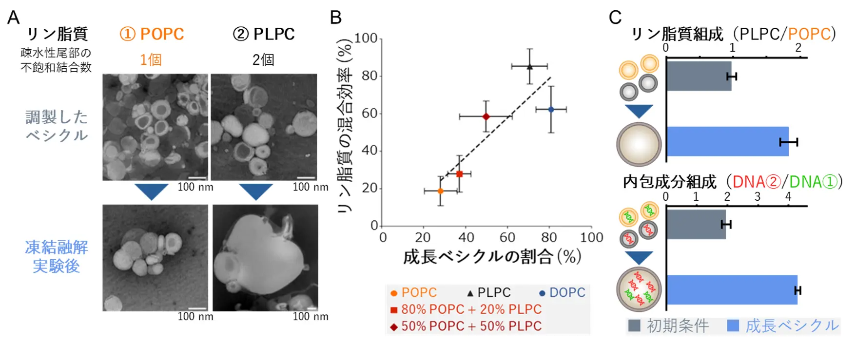 この組成継承の可能性を確かめるため、2種類のリン脂質ベシクル(POPCとPLPC)が混在する条件で凍結融解実験を行い、成長ベシクルのリン脂質の組成を解析しました。すると、成長ベシクルは予想通り、より不飽和結合の数の多いPLPCに偏った組成を示しました(図3C