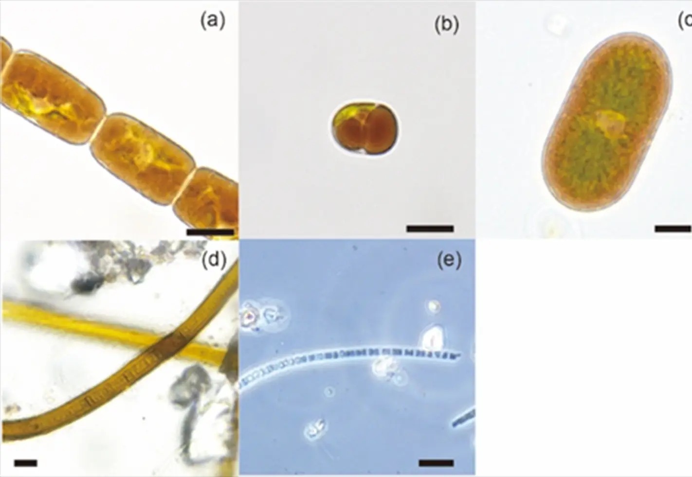 図3. クリオコナイトホール内に生息する雪氷藻類(a, b, c)とシアノバクテリア(d,e)。