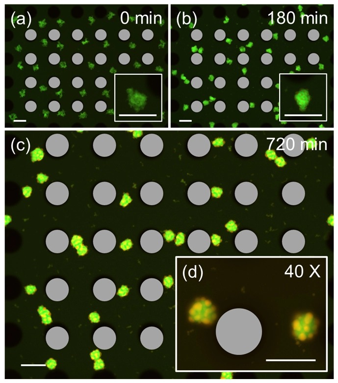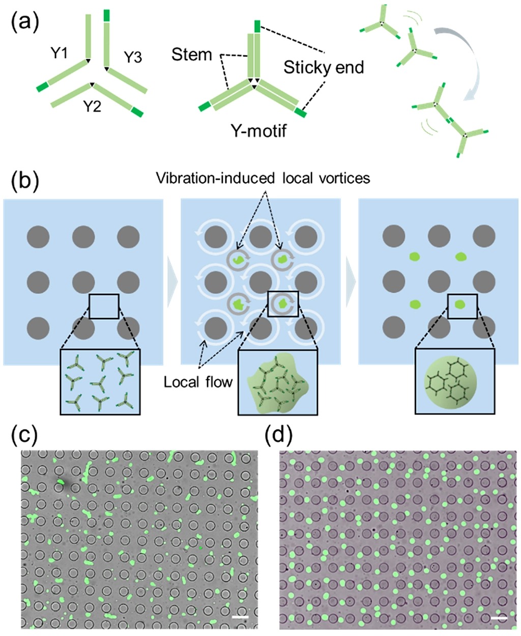 (c, d) マイクロピラー配列とDNA凝集体(緑)をそれぞれ示す、明視野観察と蛍光観察の合成画像。スケールバー = 100 µm。