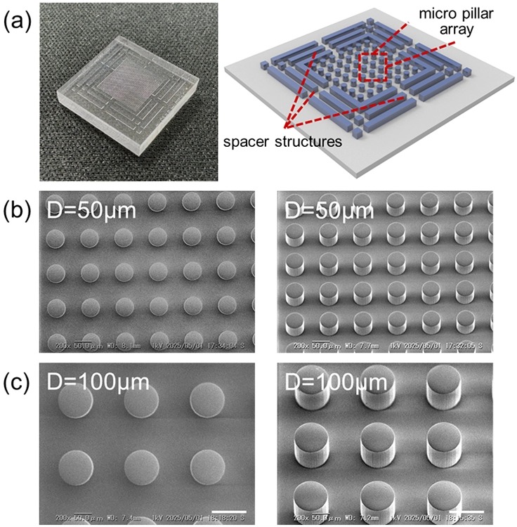 図1. (a) PDMS製マイクロピラーの外観(左)と対応する模式図(右)。模式図は中央のマイクロピラー配列領域とチャネル高さを規定する周囲のスペーサー構造を強調表示。