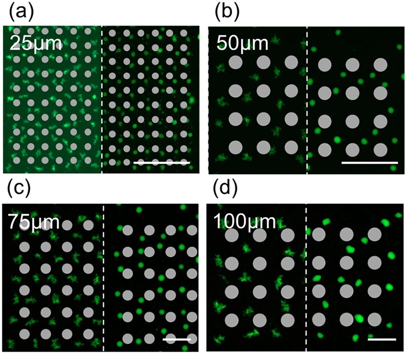 図2. (a-d) 4種類の異なるマイクロピラー直径を用いて形成されたDNA凝集体の蛍光画像。0時間(左)および4時間(右)の状態を示す。