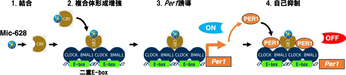 次に、Mic-628が示す極めて高い遺伝子誘導特異性(図4)は、Mic-628が転写抑制因子CRY1と結合することで、転写因子CLOCK-BMAL1複合体との相互作用を促し、この複合体がPer1