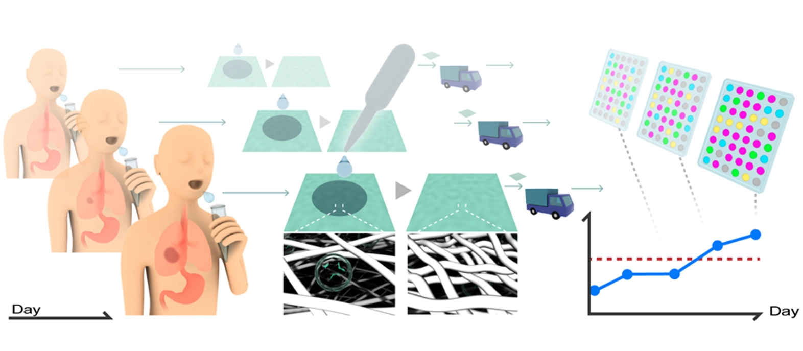 図1.本研究のコンセプト概略図。採取した唾液をセルロースナノファイバーシートに滴下して乾燥させ、そのシートを測定機関に送付することで、エクソソーム由来 microRNA を解析する。ユーザー側の操作は、「唾液をシートに載せて乾かすだけ」であり、この簡便な手順によって、日常的な microRNA 解析に基づくがんリスクモニタリングの実現を目指している。
