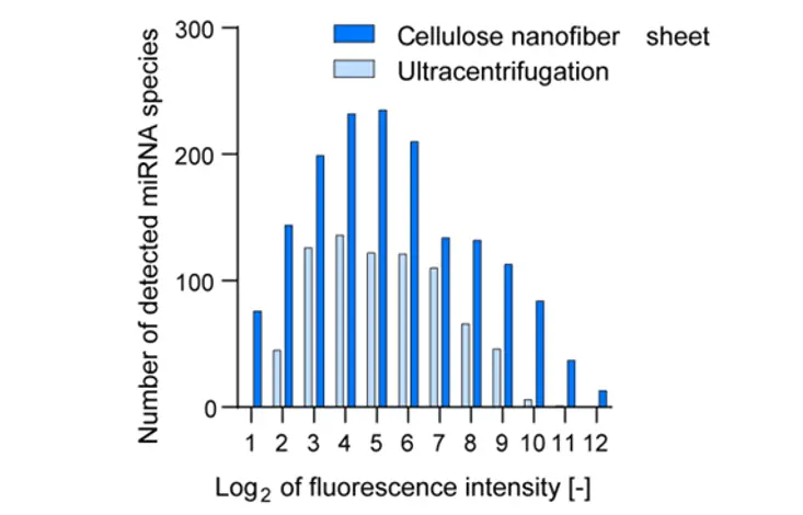 はじめに、エクソソームの捕捉に適した細孔径分布(約4~300 nm)を持つCNFシートを設計しました。次に、CNFシートへの唾液滴下量を検討した結果、わずか0.01 mLの唾液を滴下するだけで、CNFネットワーク由来の細孔内にエクソソームが効率よく捕捉されることを見いだしました。また、唾液を滴下したCNFシートを乾燥させると、CNFネットワーク構造が収縮し、捕捉されたエクソソームを包み込むように固定するので、エクソソーム内部のmicroRNAが室温でも安定に長期間保存されることを明らかにしました。乾燥させたCNFシートを回収用溶液に浸漬すると、CNFネットワーク構造が再び緩み、エクソソームを抽出できることも確認しました。さらに、従来広く用いられている超遠心法とmicroRNAの回収効率を比較したところ、同量の唾液を用いた条件において、CNFシートを用いた方法ではより多くの種類のmicroRNAを検出できることが確認されました(図2)。