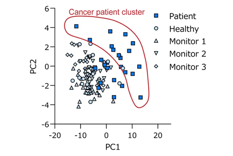図3.肺がんバイオマーカー候補 microRNA を用いた多変量解析の結果。統計解析により抽出した肺がんバイオマーカー候補 microRNA 群を用いて主成分分析(PCA)を実施した。肺がん患者由来のプロットは赤枠内の領域に集中的に分布しており、唾液中エクソソーム由来 microRNA のプロファイルに基づくがんモニタリングへの応用可能性が示された。