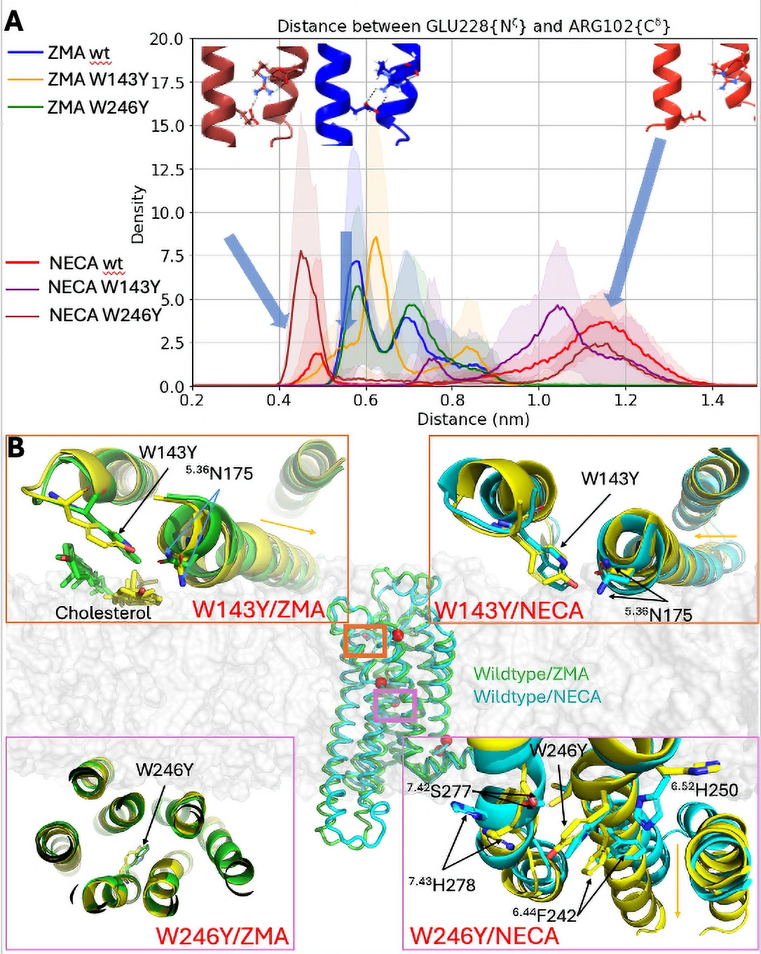 剛性理論に基づく計算解析は、アデノシンA2A受容体(A2AR)の活性化が、長距離アロステリック情報伝達経路(赤および他の明るい色でハイライト)によって制御されることを示している。多数のトリプトファン残基(スティック表示)がこれらの経路上に位置しており、GPCRの活性化と機能状態の制御に関わるアロステリック・ネットワークの重要な結節点(ノード)として機能することを支持する。
