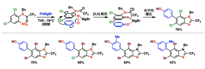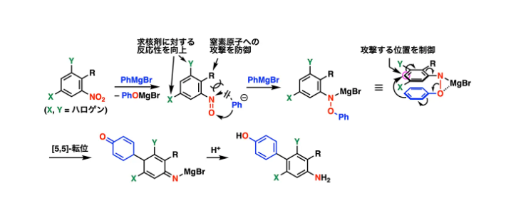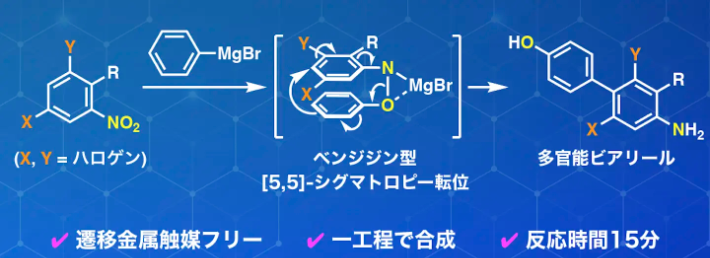 本研究では、ニトロアレーンの基質設計によってベンジジン型[5,5]-シグマトロピー転位を主経路として制御することに成功しました。この反応設計により、ニトロアレーンとアリールグリニャール反応剤から多官能ビアリールを高い位置選択性のもと一段階で構築できる新しい合成戦略を確立しました。