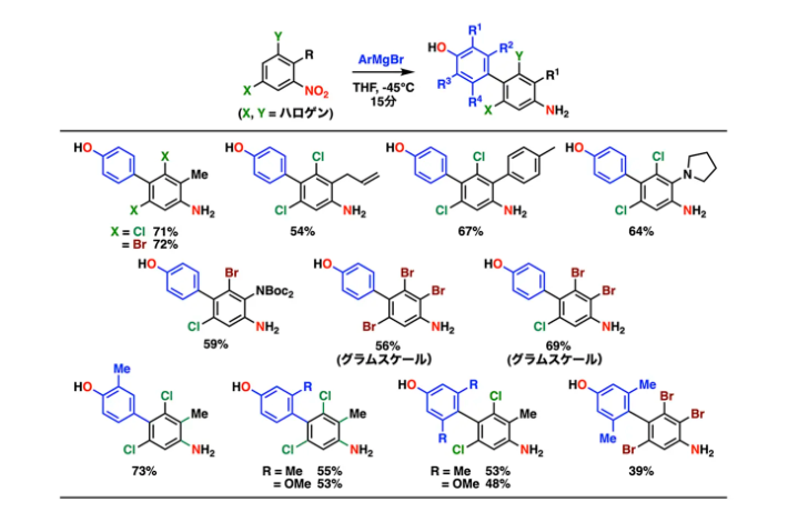 本反応は遷移金属触媒を必要とせず、-45℃の低温条件下でニトロアレーンとアリールグリニャール反応剤を反応させることで進行します。ハロゲン基、アミノ基、ヒドロキシ基など多様な官能基を保持した多官能ビアリールを高い位置選択性で合成でき、実用的なスケールにおいても再現性よく反応が進行することを確認しました(図3)。