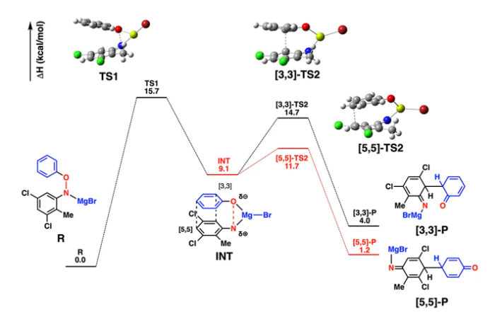 THF中における[5,5]-または[3,3]-転位生成物の形成に関する計算された自由エネルギープロファイル(M06-2X / 6-31G(d,p)、LanL2DZ(Cl, Mg, Br))[相対自由エネルギー(ΔHsolv, kcal/mol)を示している]。主要な結合距離(Å)を示した(C原子:灰色、H原子:白色、O原子:赤色;N原子:青色;Mg原子:黄色;Br原子:紫色;Cl原子:黄緑色)。