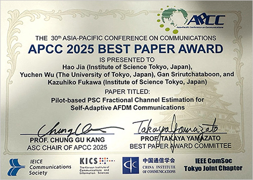 A paper presented by Mr. Jia Hao, a doctoral student in the Fukawa Lab, together with Assistant Professor Gan Srirutchataboon and Professor Kazuhiko Fukawa, has received the APCC 2025 Best Paper Award at The 30th Asia-Pacific Conference on Communications (APCC 2025).