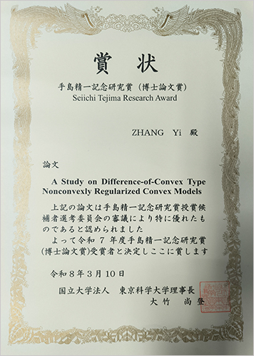 Yi Zhang さん (山田研:2024.6博士修了[現在Weizmann Institute of Science,Faculty of Mathematics and Computer Science 博士研究員])の博士論文「A Study on Difference-of-Convex Type Nonconvexly Regularized Convex Models」が高く評価され、Zhangさんが令和7年度手島精一記念研究賞博士論文賞を受賞しました。